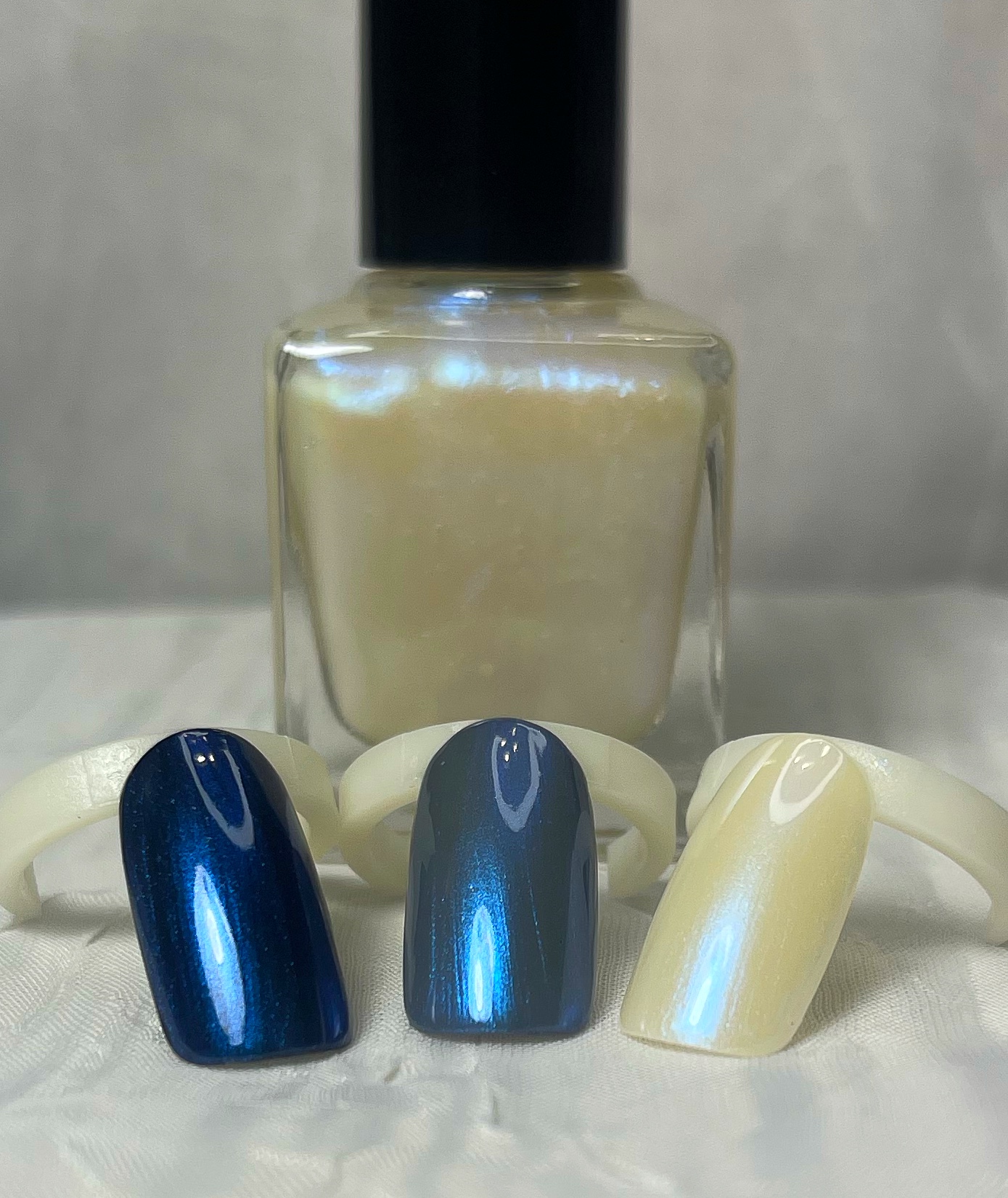 This is a versatile pale white pearl with a strong blue iridescent shift. Classic for French manicures and great over basic creams!! Shown here with 2 coats alone, and 1 coat over Basic Black, and with 1 coat over Lady Grey! topped with our 45 Second Quick Set top Coat! Its also AMAZING swirled into darker shades through marbling or gradient!