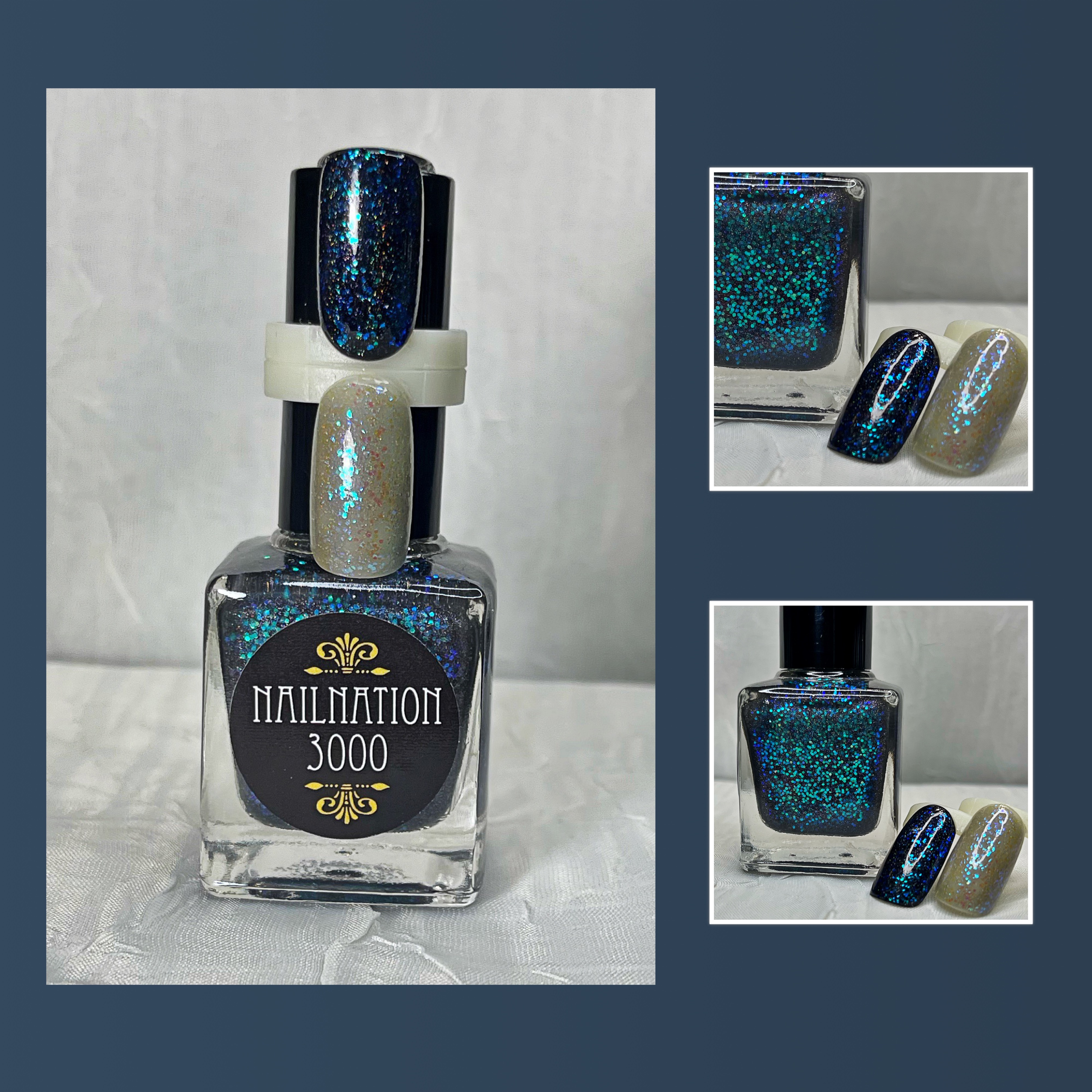 A must have topper! This has a pale translucent black very soft holo ( just added to create blended affect ) base with mermaid scale green, aqua and blue toned chrome shine square glitters! All while showing micro micas in aqua for that extra shine and sparkle! Applies smoothly and glitters to lay pretty flat! Shown here with 1 coat alone and 1 coat over our Basic Black! Can Be layered up or used over diff shades to add that dramatic flare you've been looking for! Shown with 1 coat of our 45 Second Quick set Topcoat!