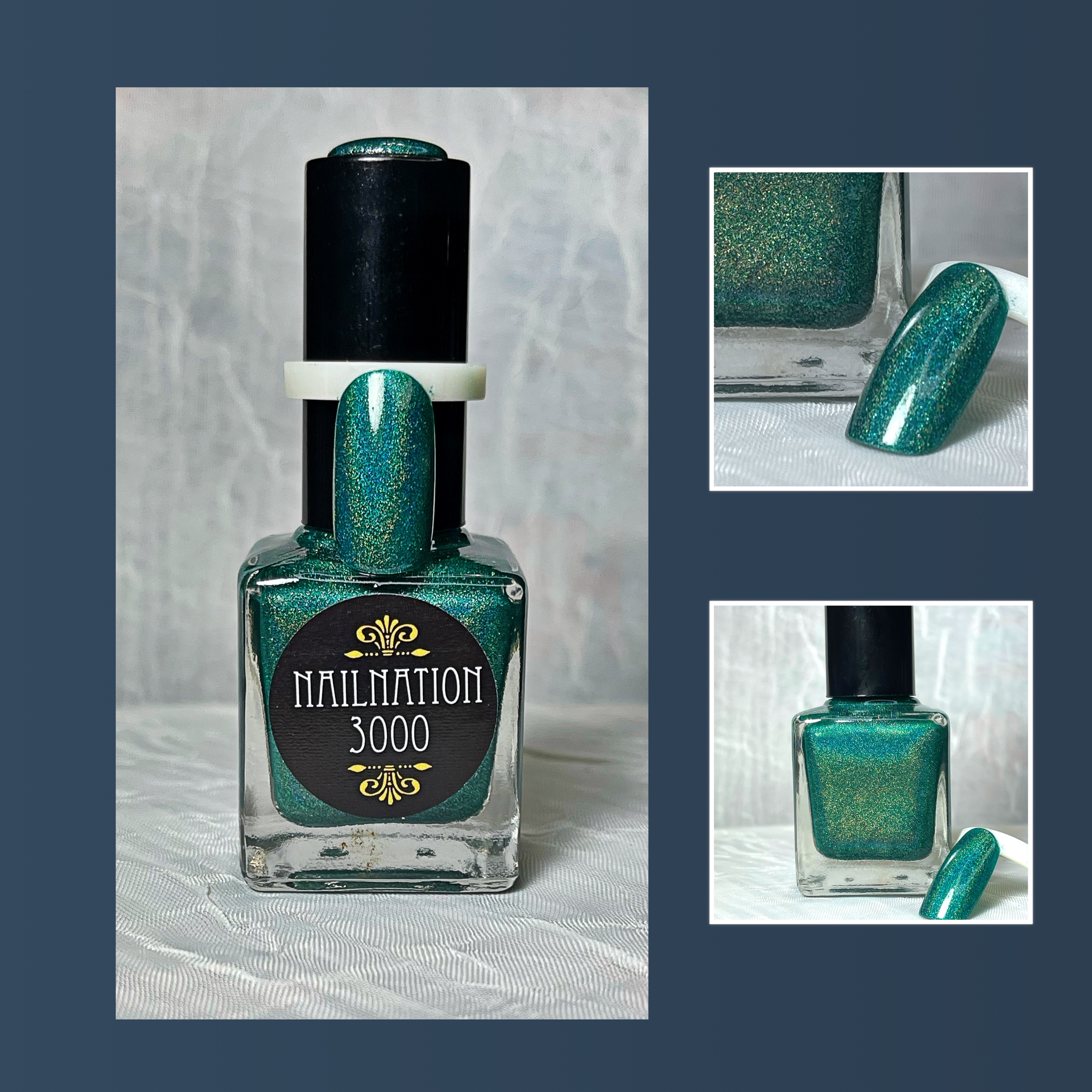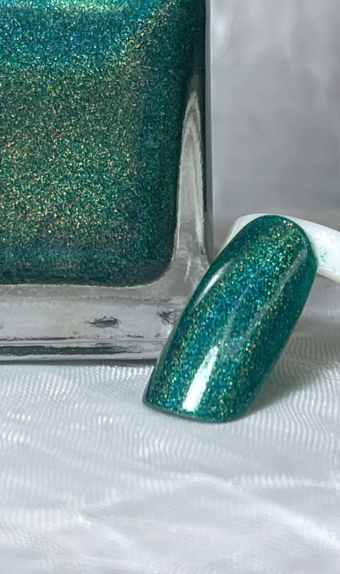 The stunning jewel toned green with a sharp holo shift and a cool and golden flame. This shade is the answer for those who love greens and want a universal tone and work appropriate yet fun holo green! This shade is easy to apply and shown with 2 coats and a single coat of our 45 Second Quick Set TopCoat. This also would be stunning with 1 coat of our green or 24k gold Color Me Holo Tinted Toppers!