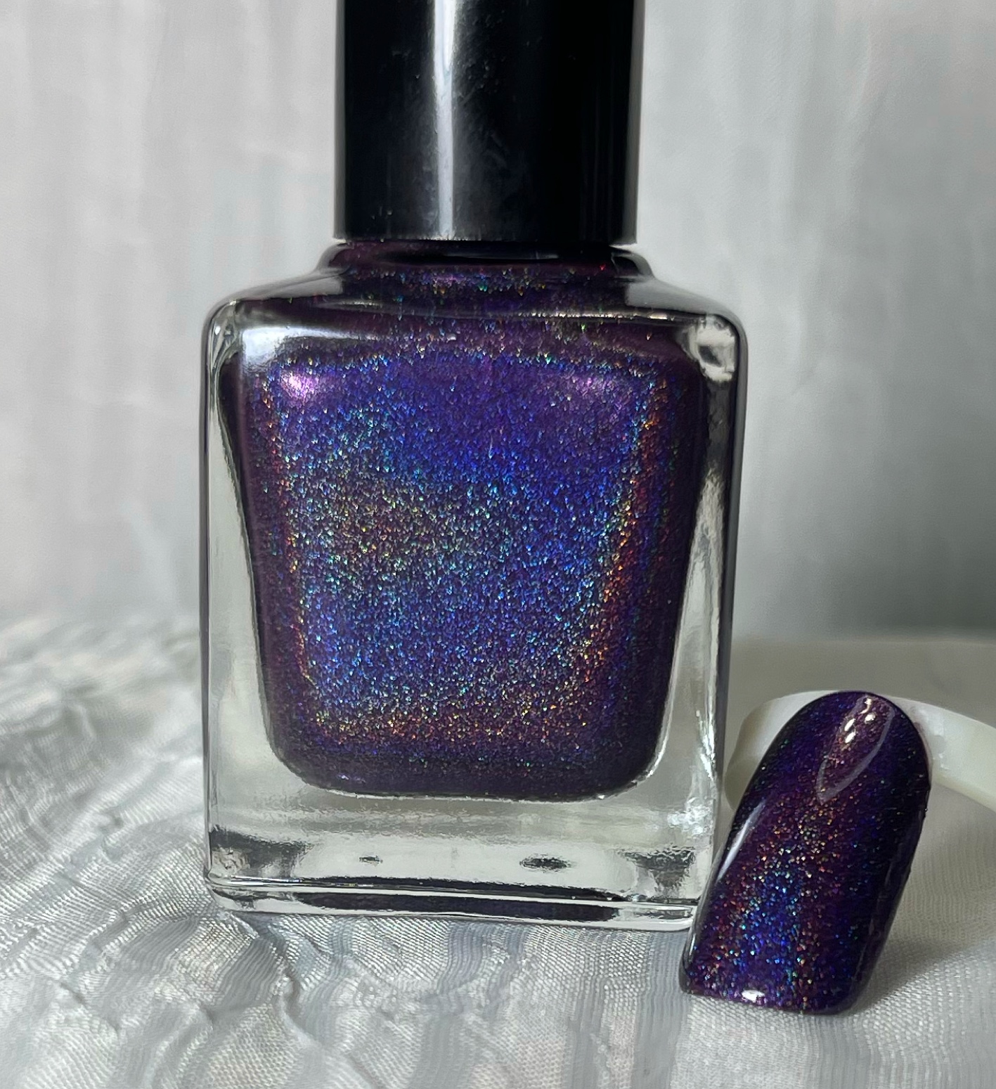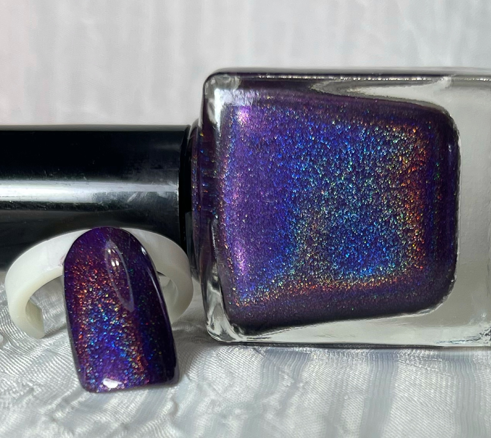 A stunning linear holo grape with a shift to pearl underneath holo tone with a warm to cool flame shift. This polish applies smooth and is 2 coat shade. Third coat can be used to obtain a deeper tone if desired. Shown with two coats. This shade is sure to please! This shade is a great anytime shade for any season! May we recommend our High Gloss or 45 Second quick set topcoats for a glossy shine! You may also enjoy some of our Color Me Holo Color Tint Holo Toppers as a fun way to add shade and tint changes or added holo!