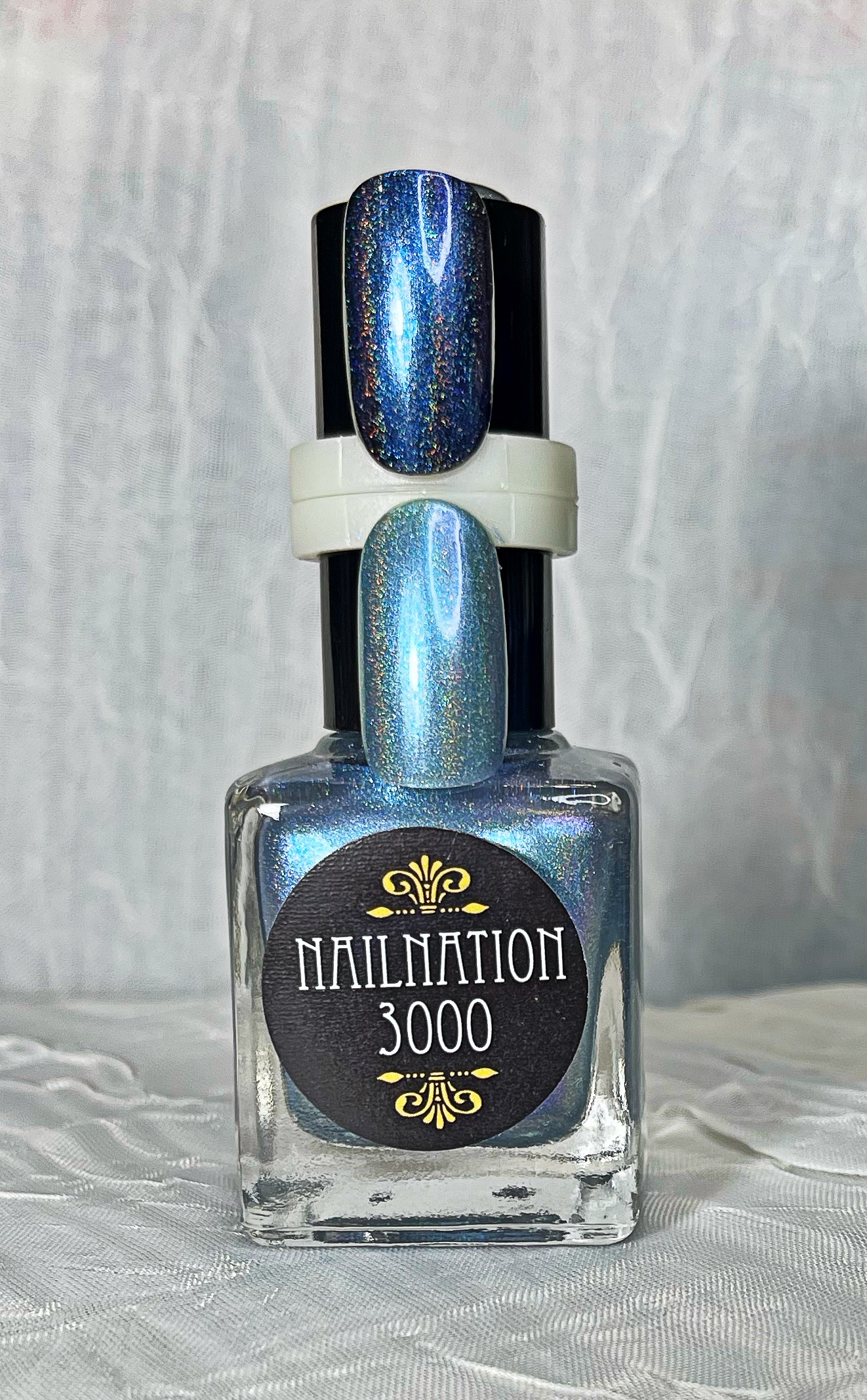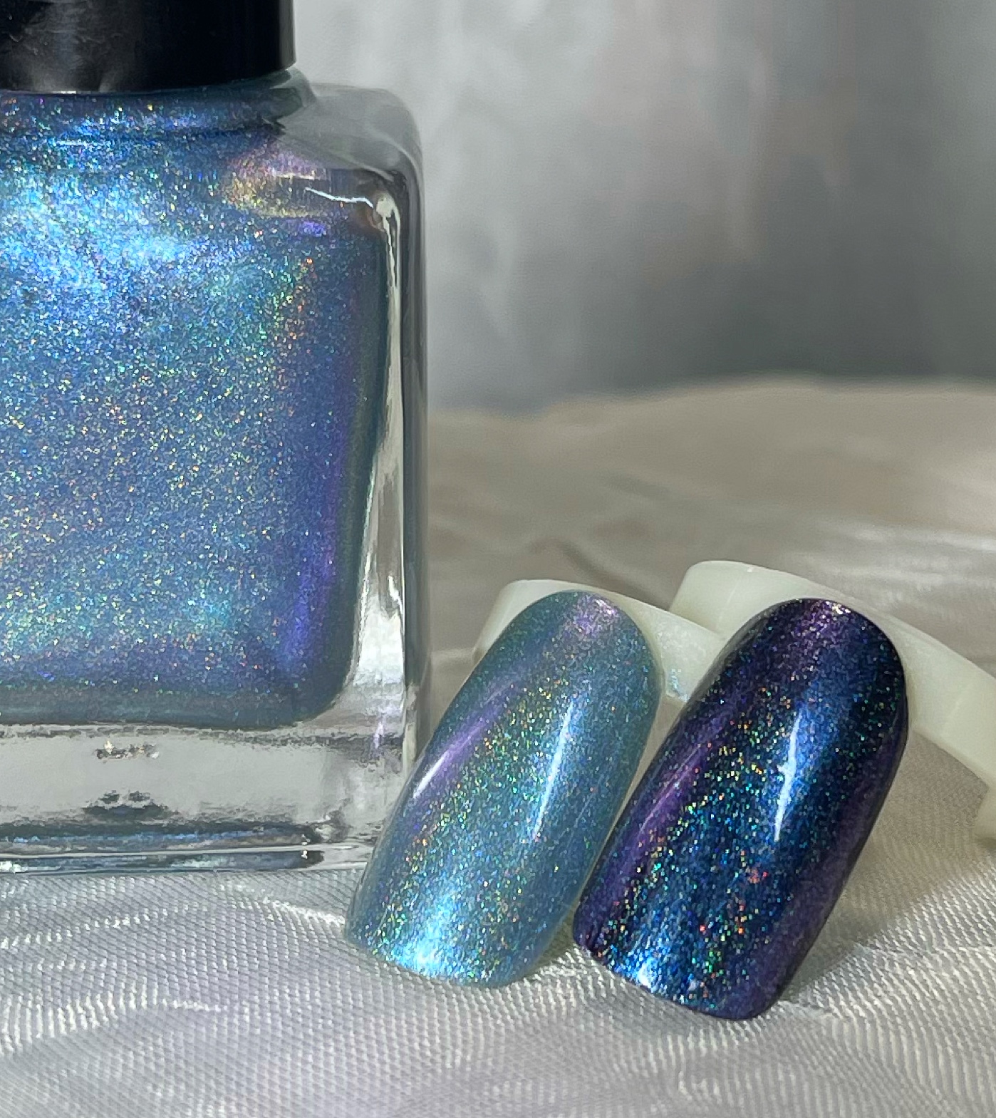 This is the base color for this color and the soft lilac shift is simply over it! Its a pearlescent medium holo sheer color that looks great alone or over jewel tones and layered up! Shown here with 2 coats alone and also 1 coat over out Basic Black! This polish comes with a .5 ml basic black! Applies smooth and sjow with 1 coat of our High Gloss TopCoat