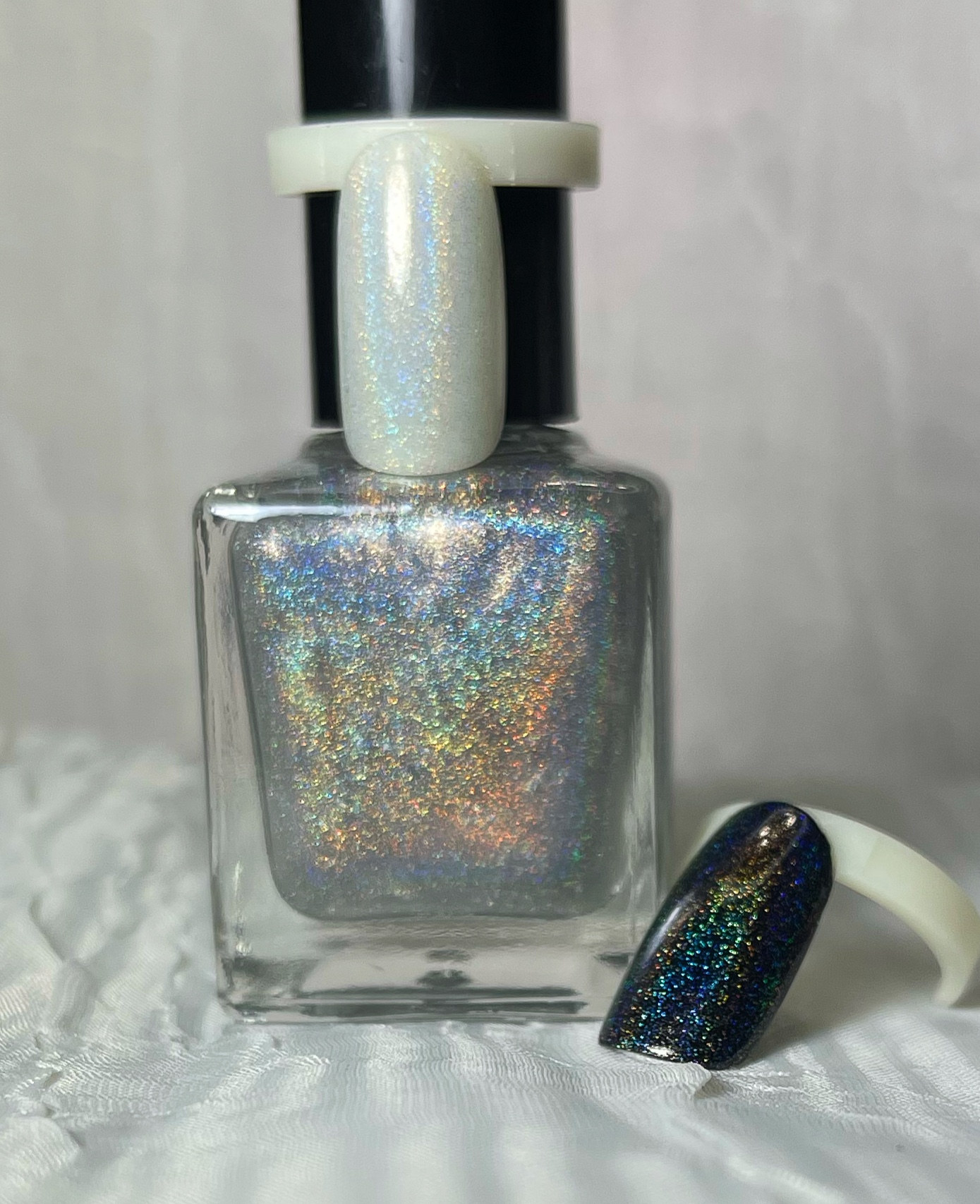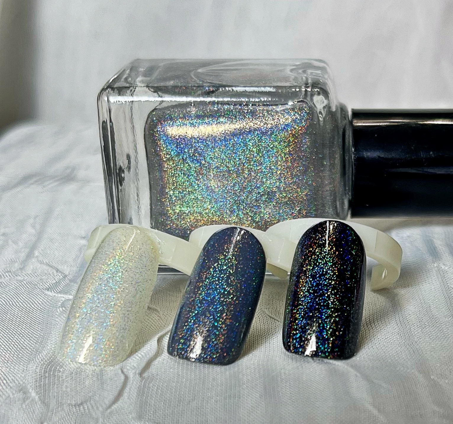 This one is a mixture of a scattered holo with a medium linear base, This topper gives you a new option to a silver holo topper without so much of the "greying" affect! 3 coats would give you a translucent but strong holo shimmer and can be used over and under French Mani's! Especially radical color French Mani's!!! This is shown as 2 coats alone and 1 coat over our basic black! Topped with a single coat of 45 Second Quick Set topcoat! If you try it let me know what you think!! Maybe more batches to come!